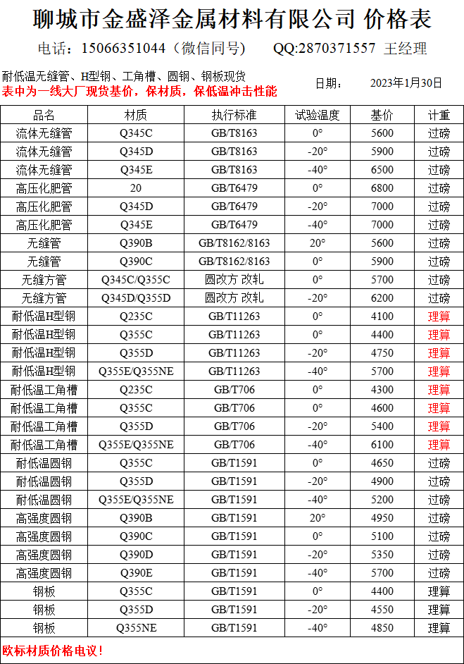 2023年1月30日 耐低溫鋼材價格基價表